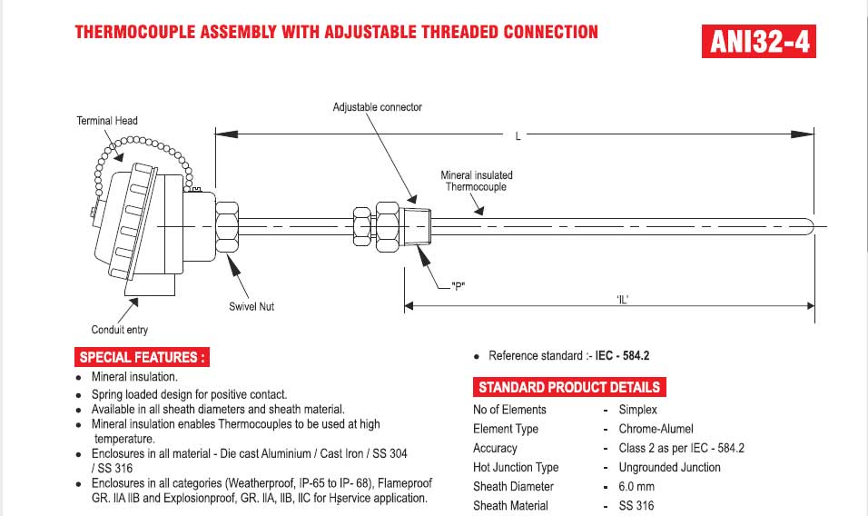 HomeThermocoupleThermocouple Assembley With Adjustable Thread Connection